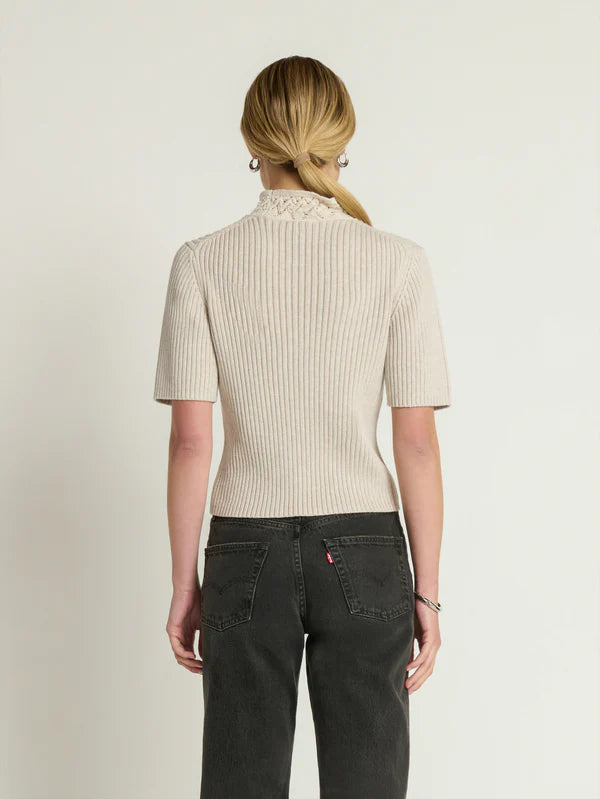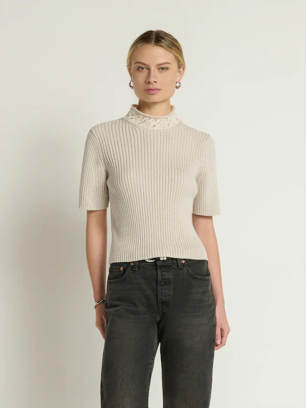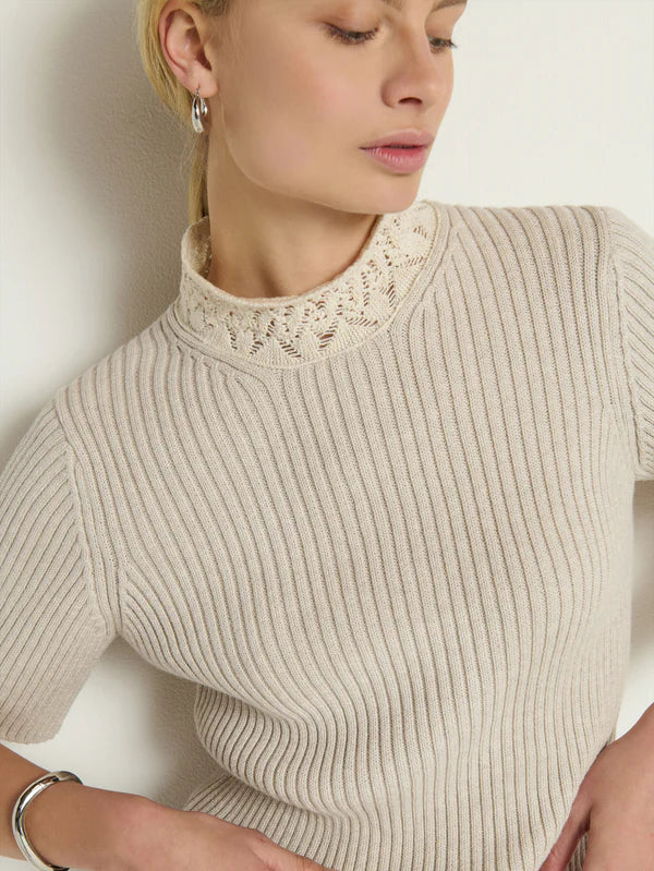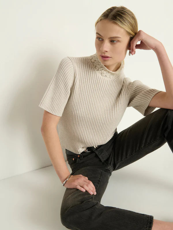 Meet the sweater tee that hasn’t been done before. The Aurora is knit in a wide ribbing from 100% Pima Cotton with lace crochet details along the neck.