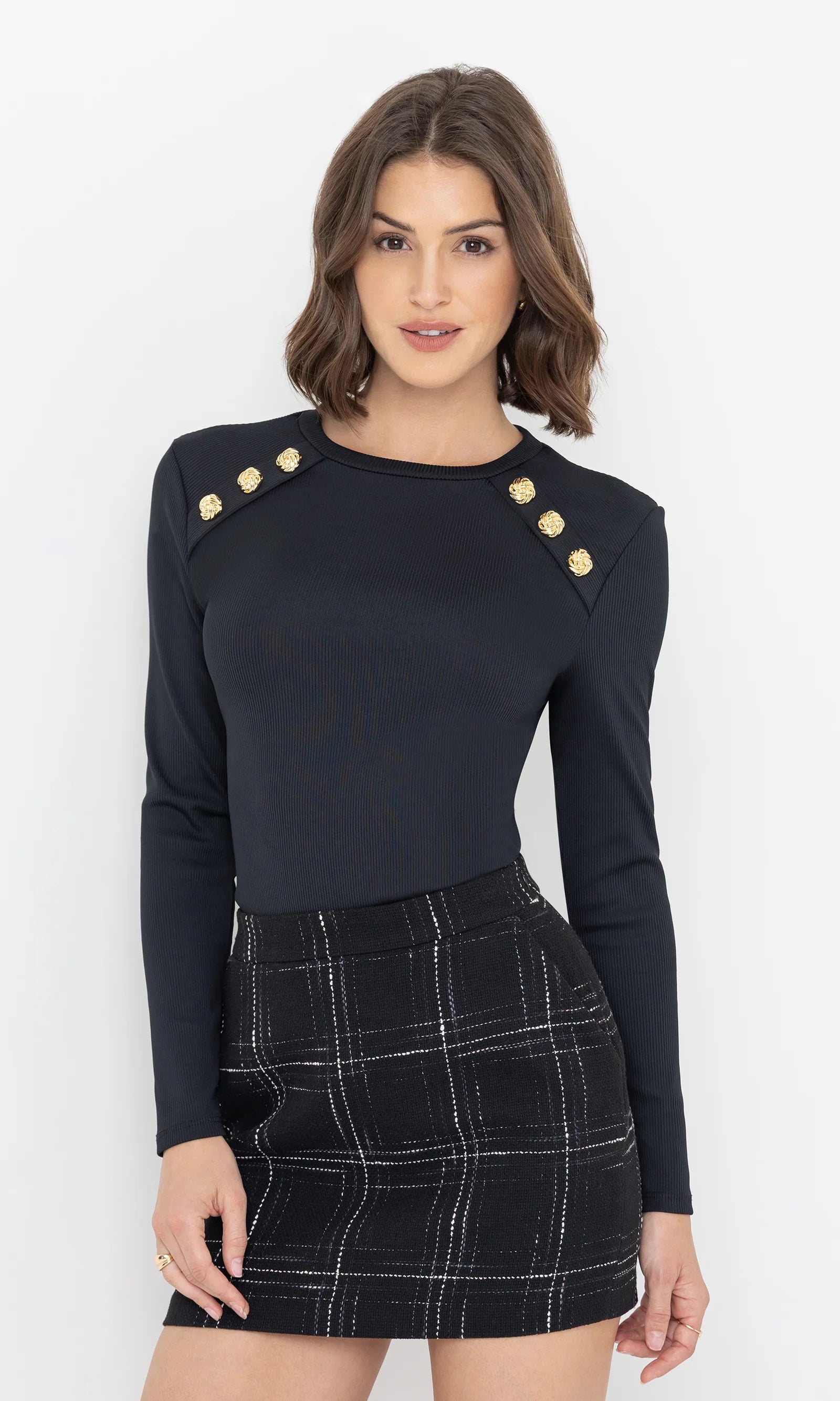 Gold buttons provide a stylish finishing touch to this fine rib jersey top. A wardrobe essential, it pairs perfectly with skirts, jeans, or tailored pants for an effortlessly stylish look.