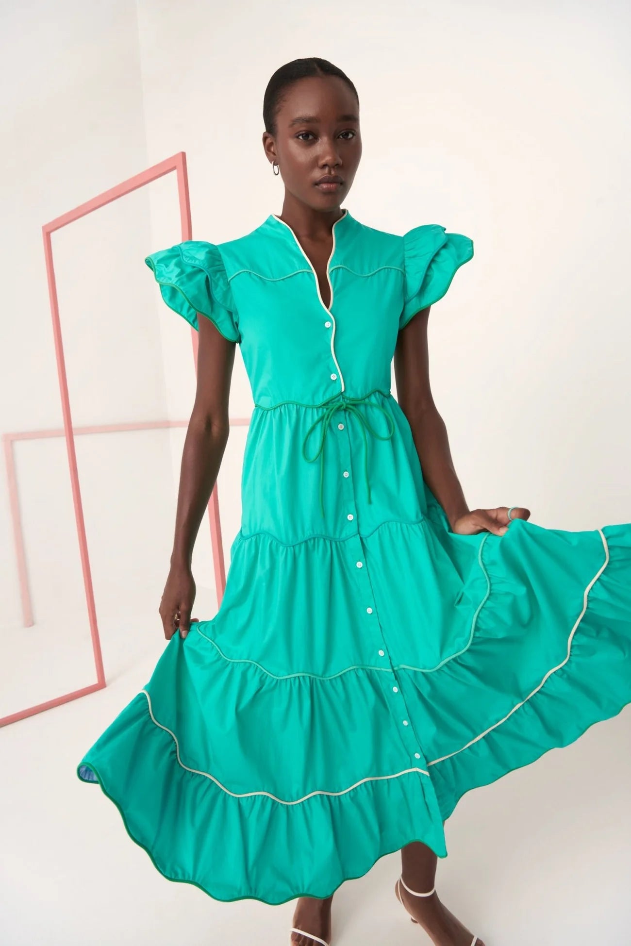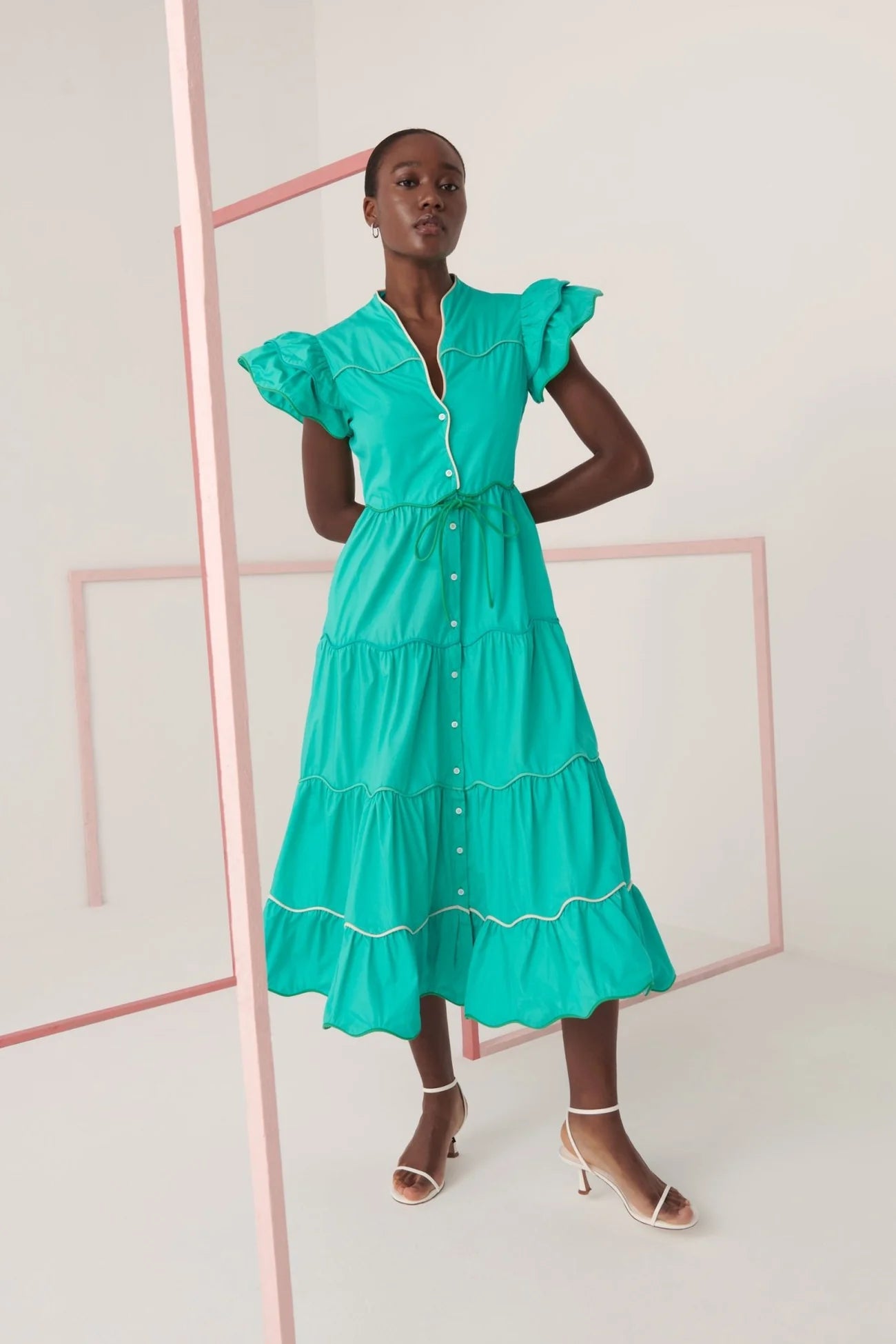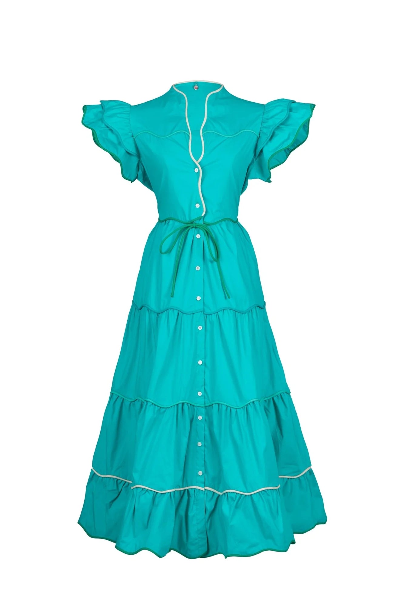 One of our all time favorites, we've reimagined the Baba Dress. This time, in a deep blue shade with our signature scalloped detailing in whites and greens. Short sleeved, long dress, button down and deep v-neck, cinched at the waist for the most flattering look and... the best part? The pockets!