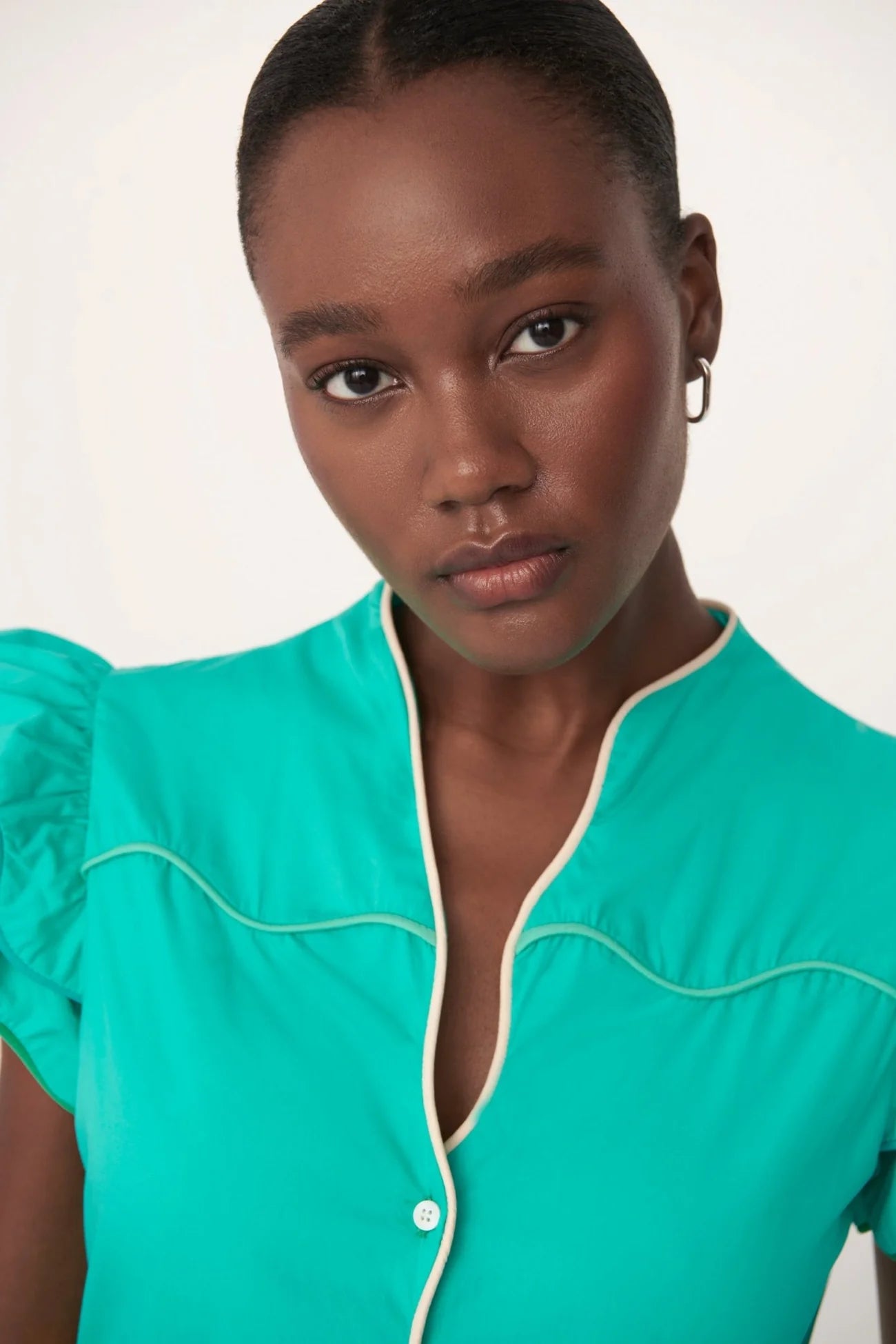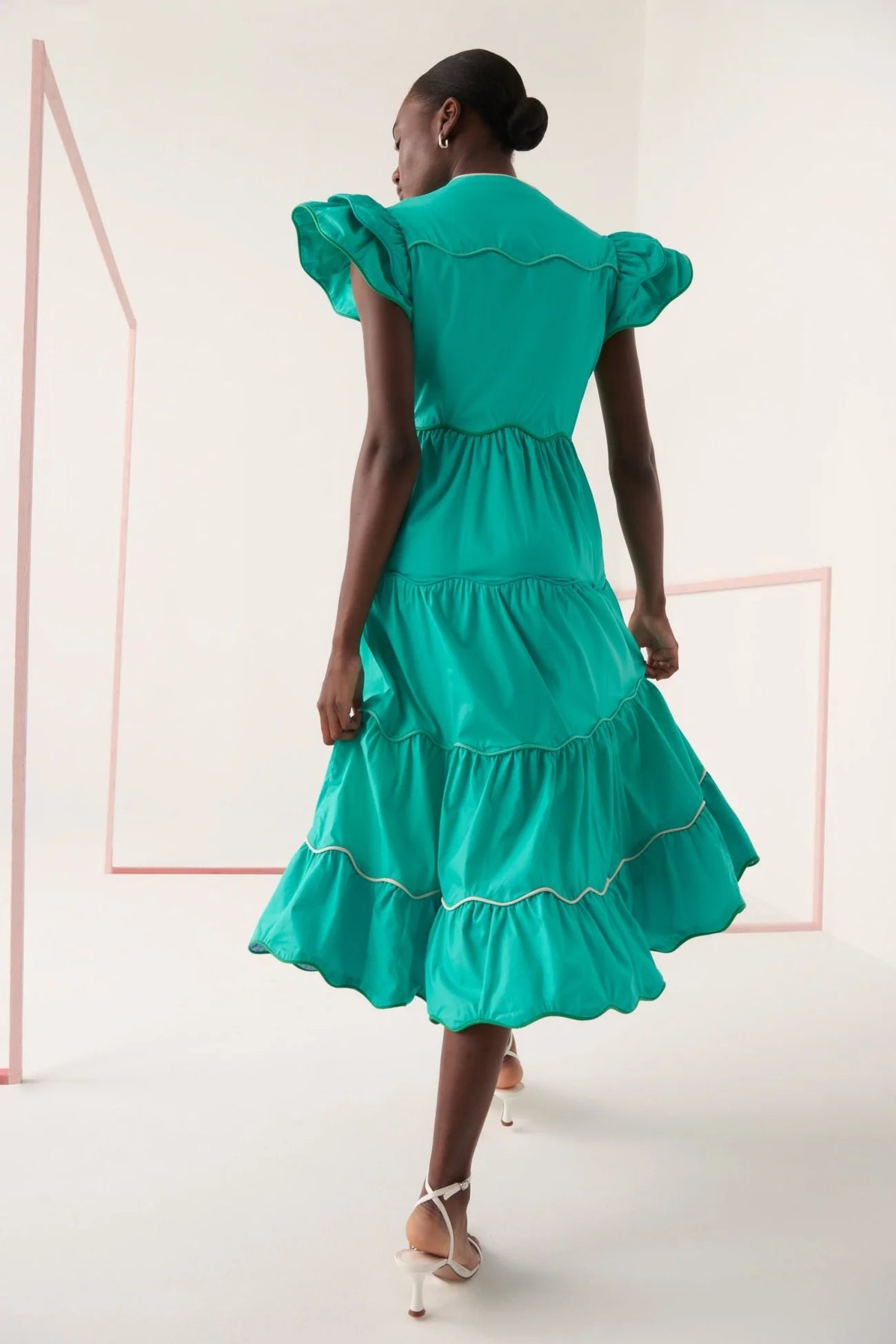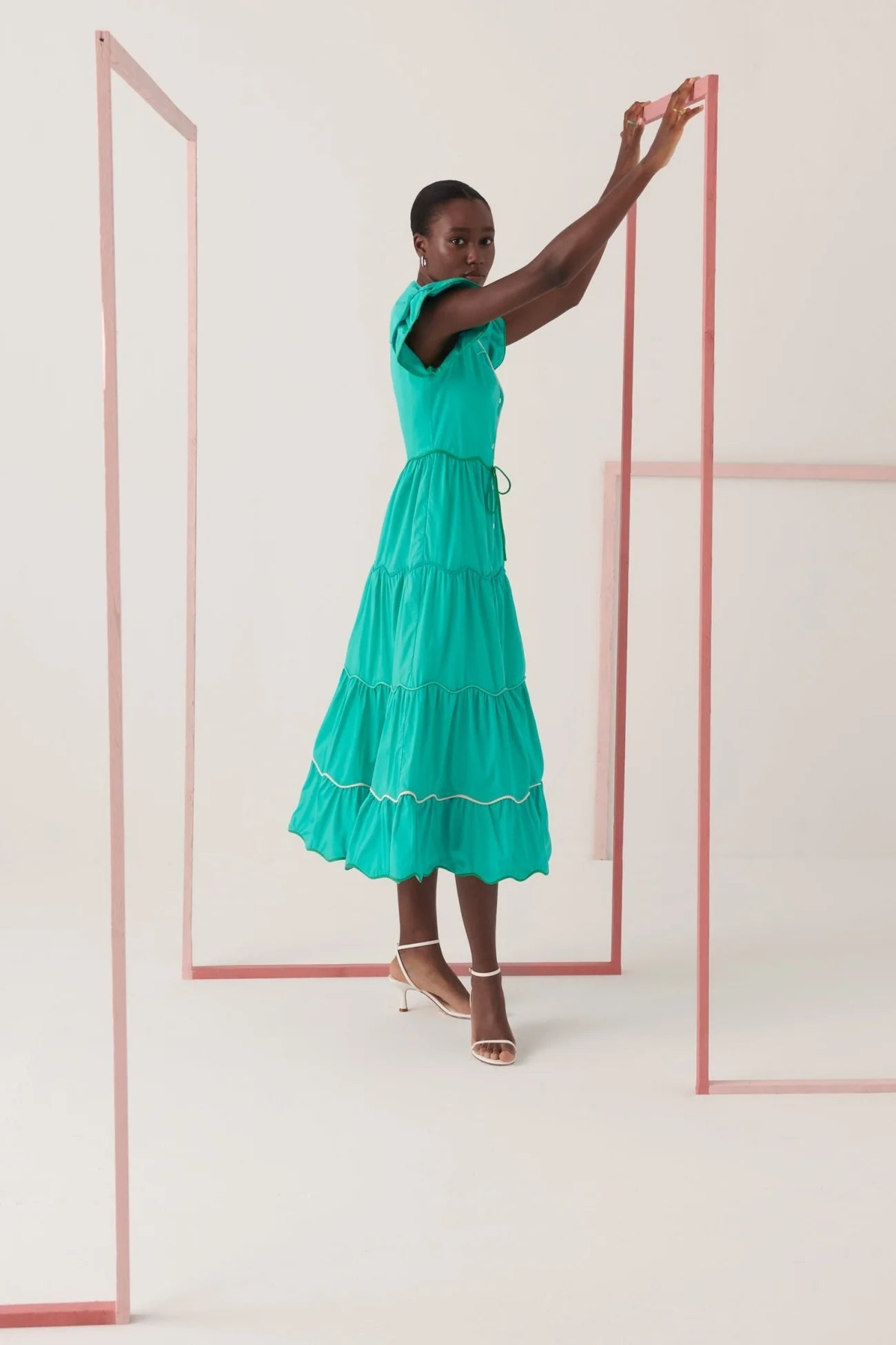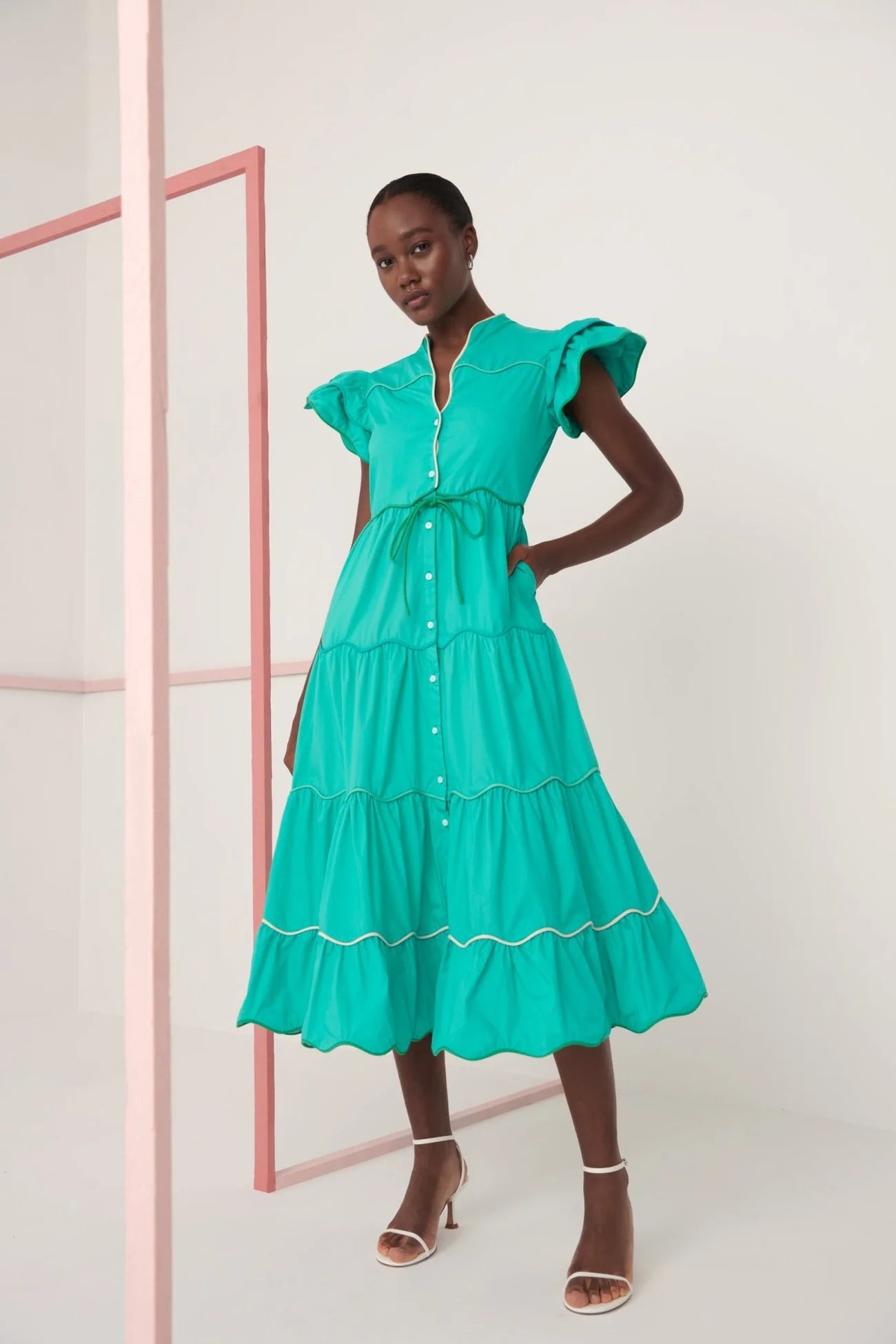 One of our all time favorites, we've reimagined the Baba Dress. This time, in a deep blue shade with our signature scalloped detailing in whites and greens. Short sleeved, long dress, button down and deep v-neck, cinched at the waist for the most flattering look and... the best part? The pockets!