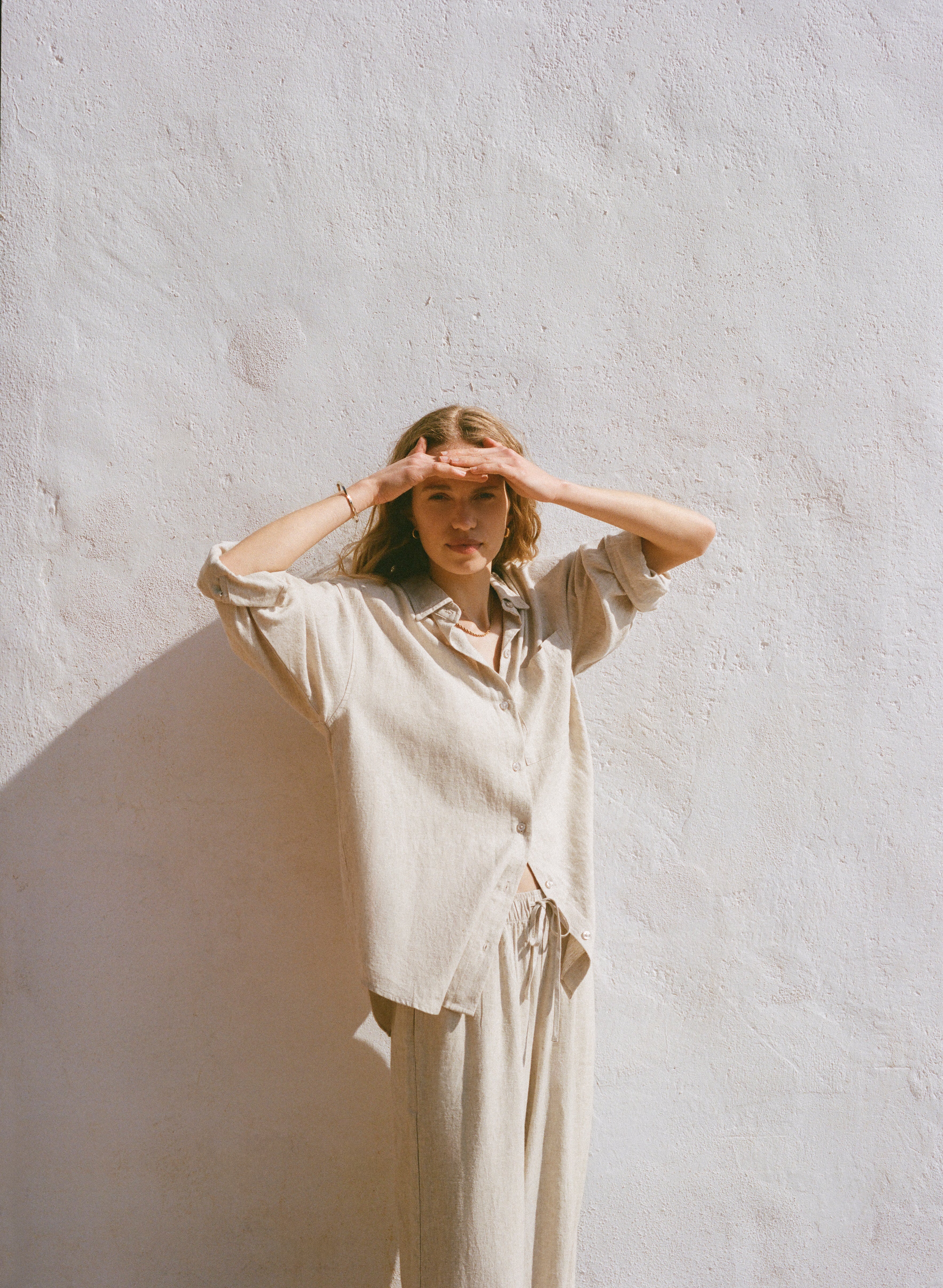 Easygoing meets elevated in this linen button-up, designed with a perfectly draped silhouette, collared neckline, and relaxed sleeves. It’s refined simplicity at its best.