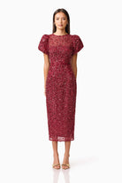 The Carmen Dress in red combines elegance and subtle drama with its structured puff sleeves and fitted bodice. Crafted from soft beaded mesh, it features a delicate shimmer and textured detail that enhances its classic midi silhouette. The fabric’s slight stretch ensures comfort while maintaining form, complemented by a fully lined interior and an invisible back zipper for a polished fit. Perfect for weddings, formal dinners, or evening occasions, this dress offers a sophisticated and refined look that makes a memorable impression.