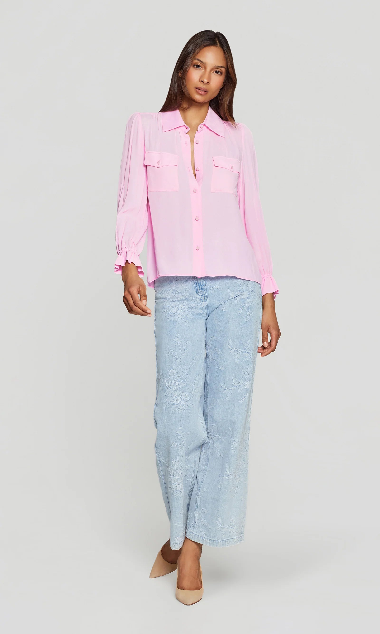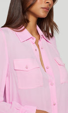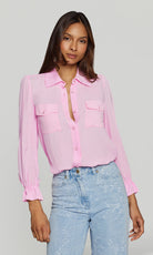A sleek essential with subtle drama. The Priya Georgette Shirt features soft georgette, flap pockets, and feminine gathered sleeves for an elevated take on a classic button-down. Lightweight, fluid, and endlessly versatile — it’s the perfect piece to dress up for night or style effortlessly for daytime polish.