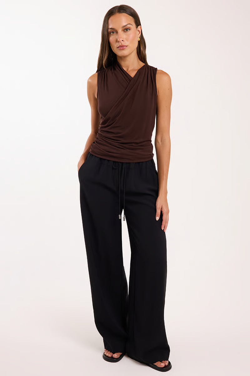 The Zelda Top is designed in a lightweight stretch modal fabrication that is drapey and has a soft, smooth hand feel. This sleeveless top features an asymmetrical neckline, draped design through body and finishes at hip length.