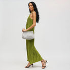 The Hazel Clutch is designed to make a sparkling statement with rhinestones all over and a chic ruched design. A detachable chain strap lets you switch from clutch to crossbody in seconds, while the snap frame closure keeps everything secure. Perfect for weddings, holiday parties, or elegant dinners, its fabric-lined interior with a zip pocket keeps your essentials close.