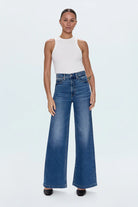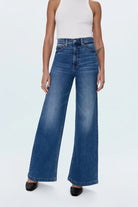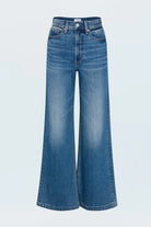 A relaxed, ultra wide leg silhouette with a high rise waist, full length leg, and a clean finished hem. Crafted from our signature comfort stretch denim to provide a structured shape with just the right give. Finished in an easy medium dark comfort stretch fabric, these jeans promise to be a versatile staple you'll reach for day after day, effortlessly transitioning from casual outings to dressier occasions.