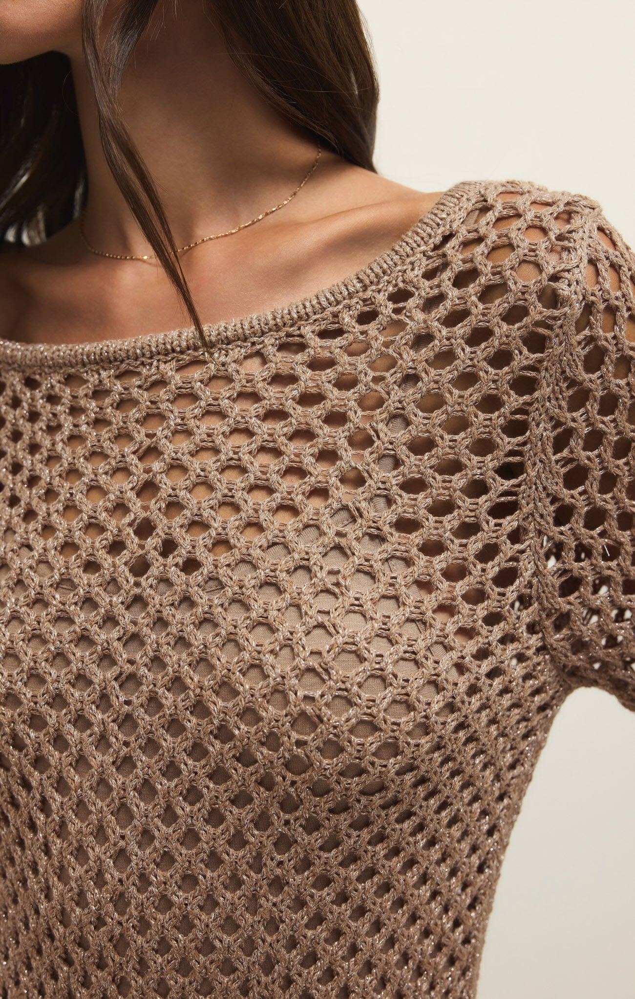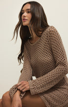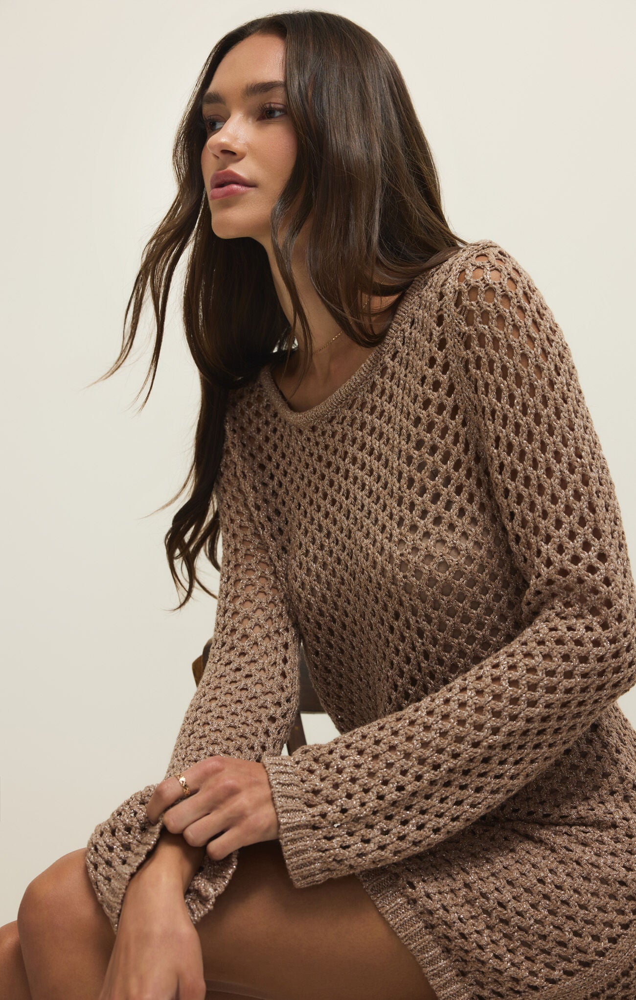 This long-sleeve mini dress features warm campfire brown tones enhanced by delicate gold shimmer yarn that catches the light beautifully. The removable liner offers flexibility—wear it as a standalone dress or layer it as an elegant cover-up over your favorite swimwear. Perfect for those who appreciate refined, multifunctional pieces that transition effortlessly between occasions.
