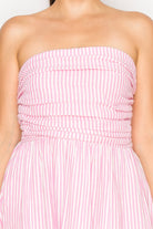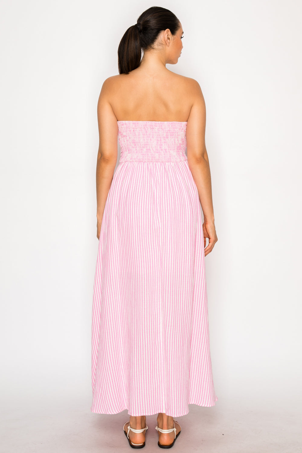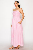The Lucy Stripe Maxi Dress, where soft pink and white stripes capture the essence of spring. The smocked back design ensures a comfortable, flattering fit that moves with you. Perfect for layering with a denim jacket and sandals, this dress transitions effortlessly from casual outings to weekend gatherings.