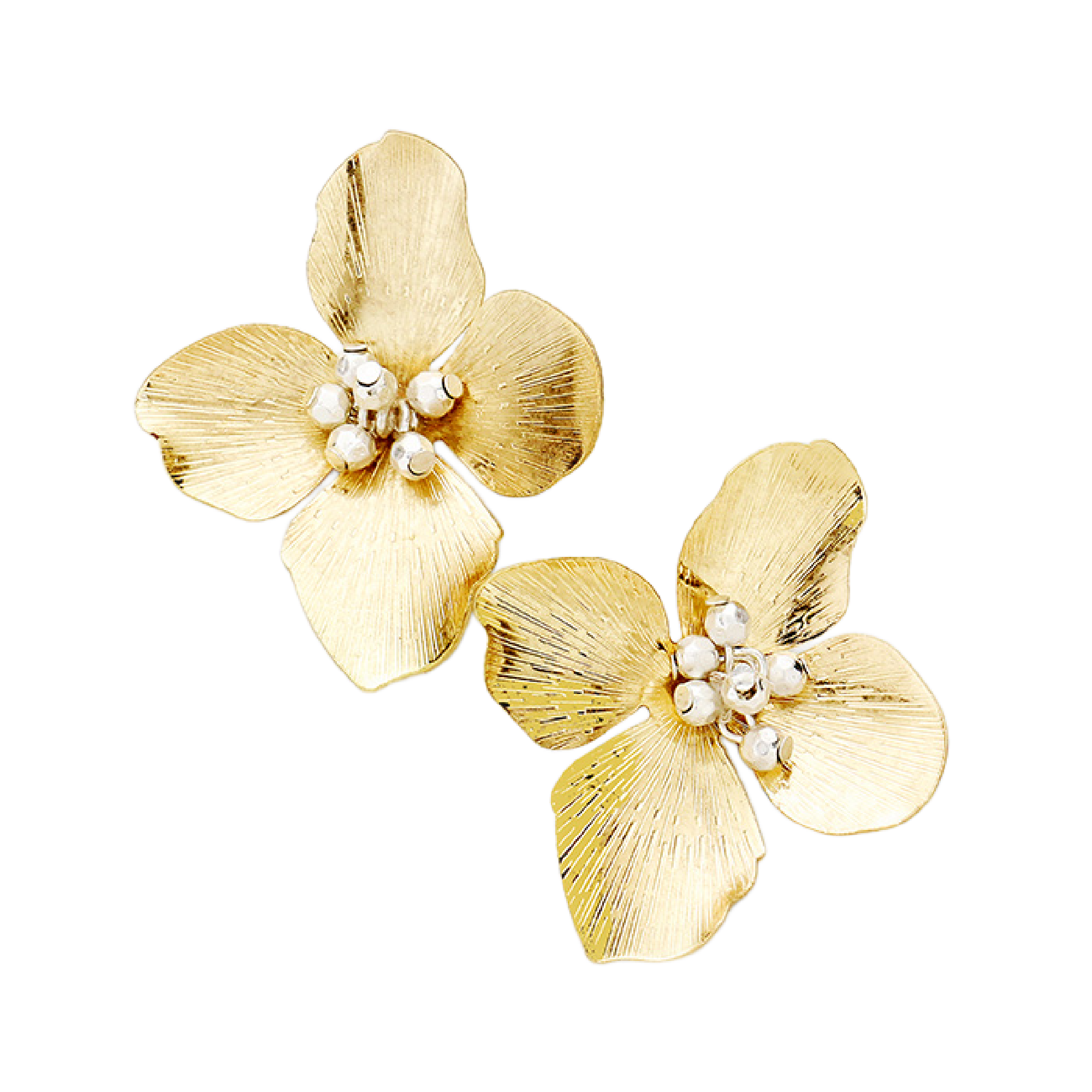 Delicately sculpted with luminous beadwork, these gold flower earrings bring a refined touch of radiance to any look. Their graceful design captures light with subtle brilliance, offering a balance of femininity and modern elegance perfect for both day and evening wear.