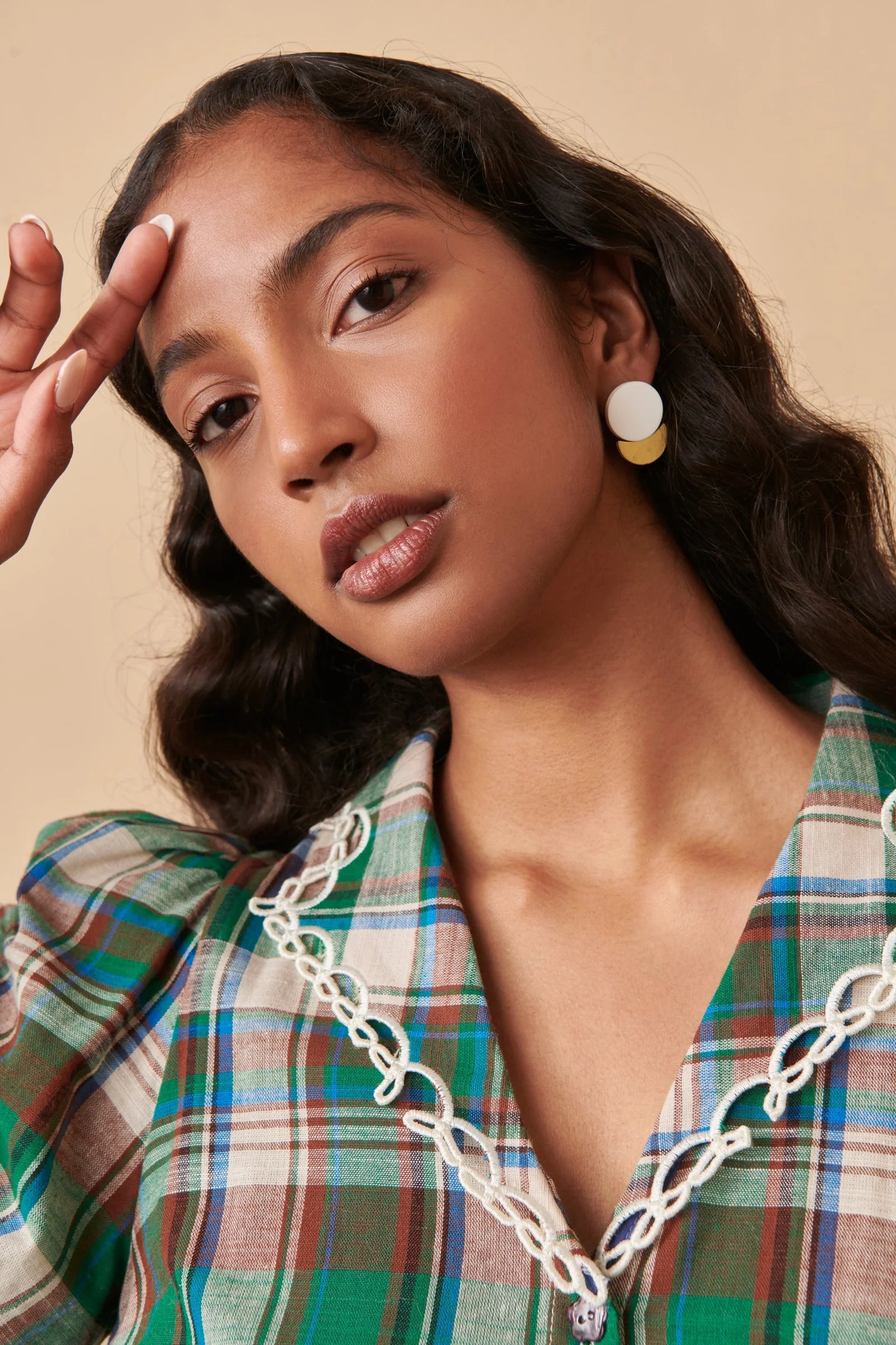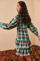 The Luar Dress combines rustic charm with playful femininity. Crafted in a green, brown, and cream plaid, it features a tiered mini silhouette with delicate white lace trim at the collar, hem, and tier seams. Long puff sleeves with buttoned cuffs balance the short length, while a drawstring waist allows for a customizable fit. Perfect with tall boots for a cozy yet polished winter look.