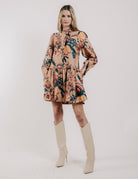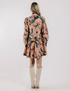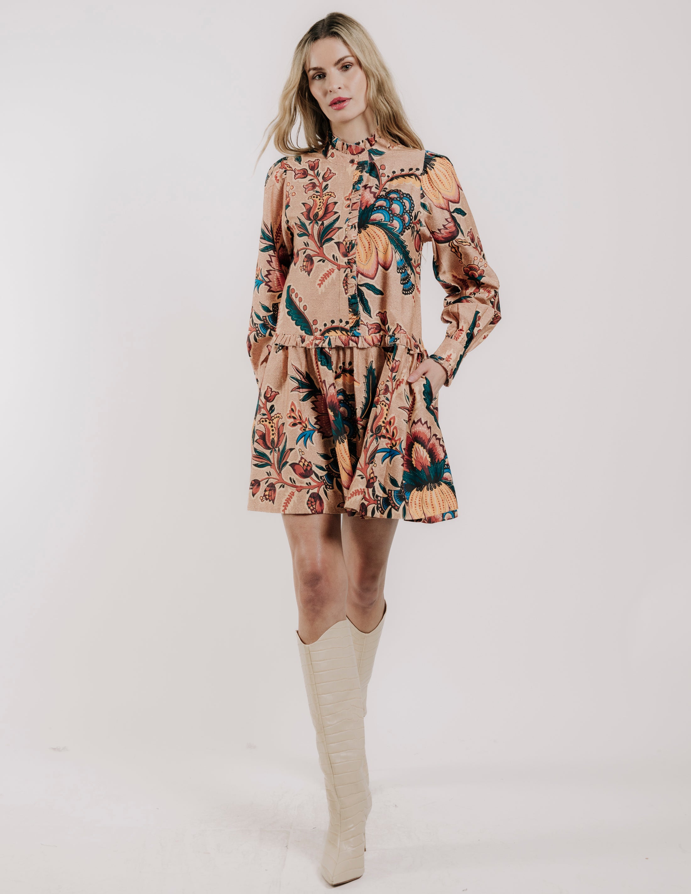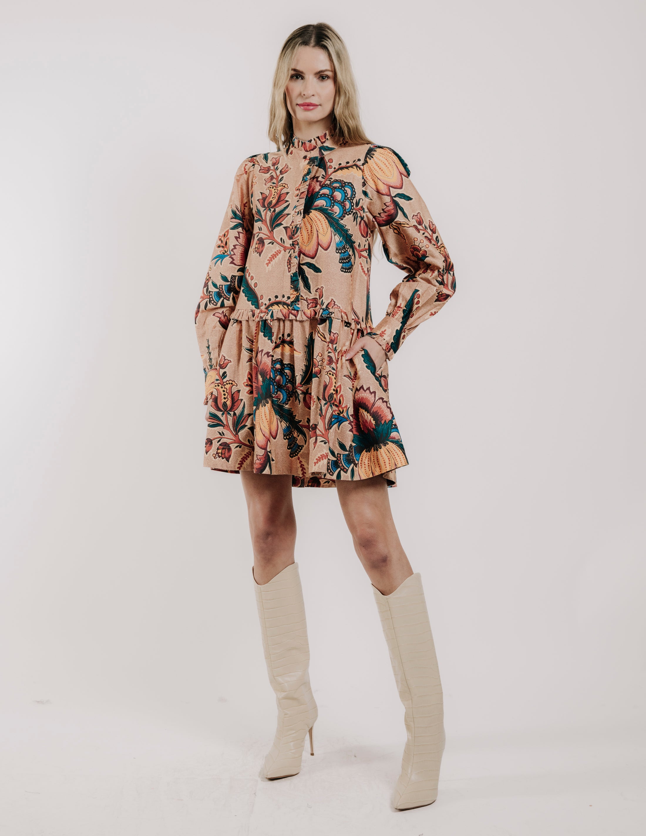 The Rubith Mini Dress, our newest boho mini, is available in a floral print with rich earthy tones. Featuring a high neckline, long puffed sleeves with gathered cuffs, and a dropped waist this dress is the perfect fall transition piece.