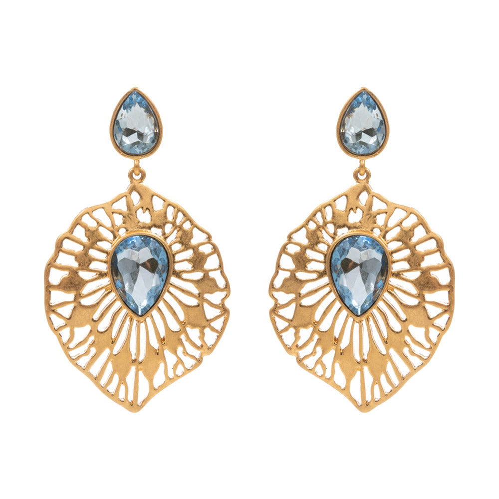 These elegant drop earrings feature intricate gold leaf filigree adorned with delicate light blue rhinestones, adding a refined sparkle to your look. Perfect for making a sophisticated statement, they enhance any outfit with a touch of graceful shimmer.