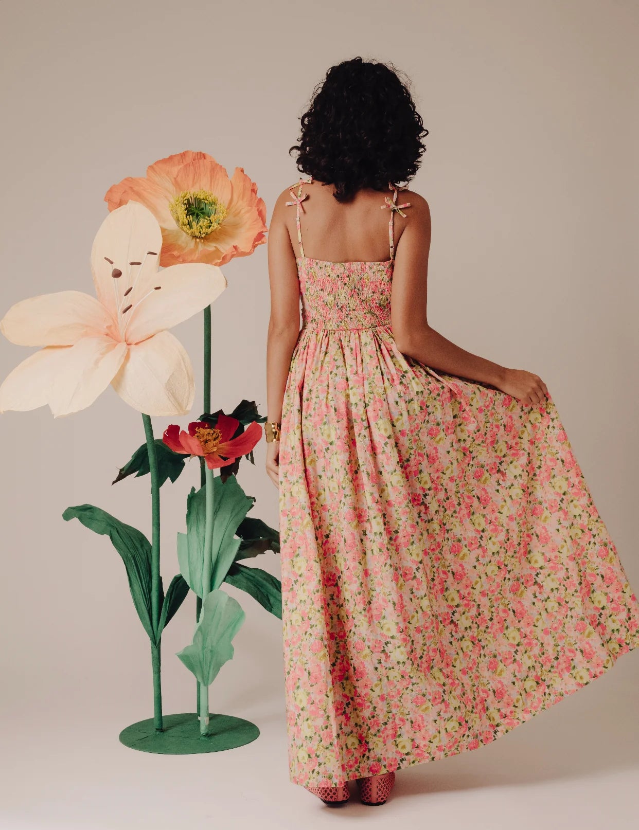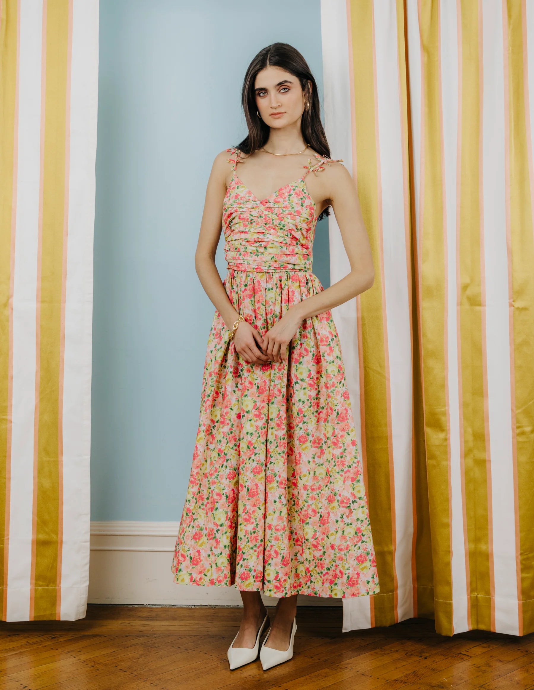The romantic Micah Dress, features mini bows at the straps and an elegantly draped and gathered front bodice. This whimsical long dress has pockets and a smocked back bodice for ease.
