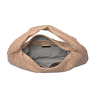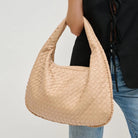 The Victoria Woven Hobo in Natural features a slouchy silhouette crafted from woven vegan leather, combining style with ethical materials. It secures with a zipper closure and offers organized storage with one zip pocket and two slip pockets inside, making it a practical shoulder bag for everyday use.