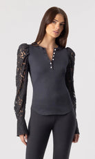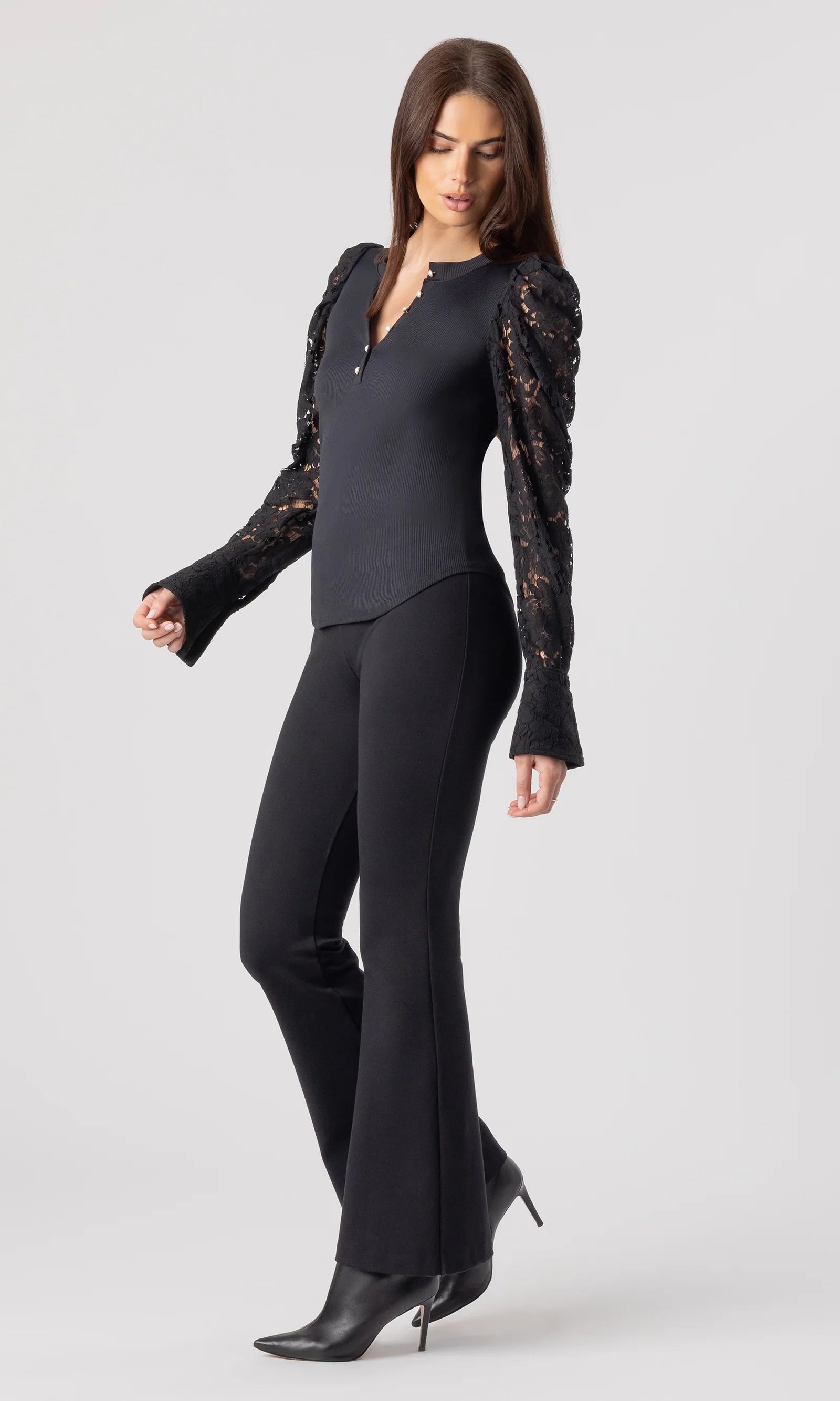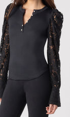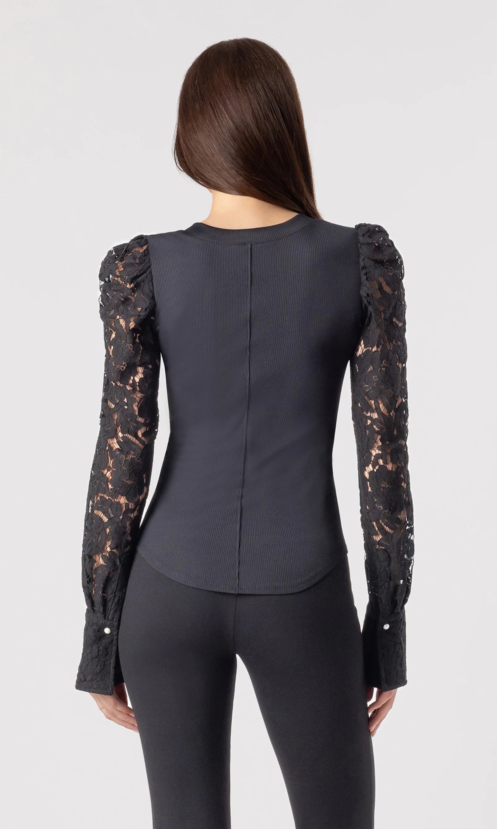 This fine rib jersey top captivates with floral corded lace sleeves that create a distinctly dramatic look, while delicate faux pearl buttons add a feminine finish. Style it with black vegan leather pants for a sleek monochrome moment.