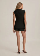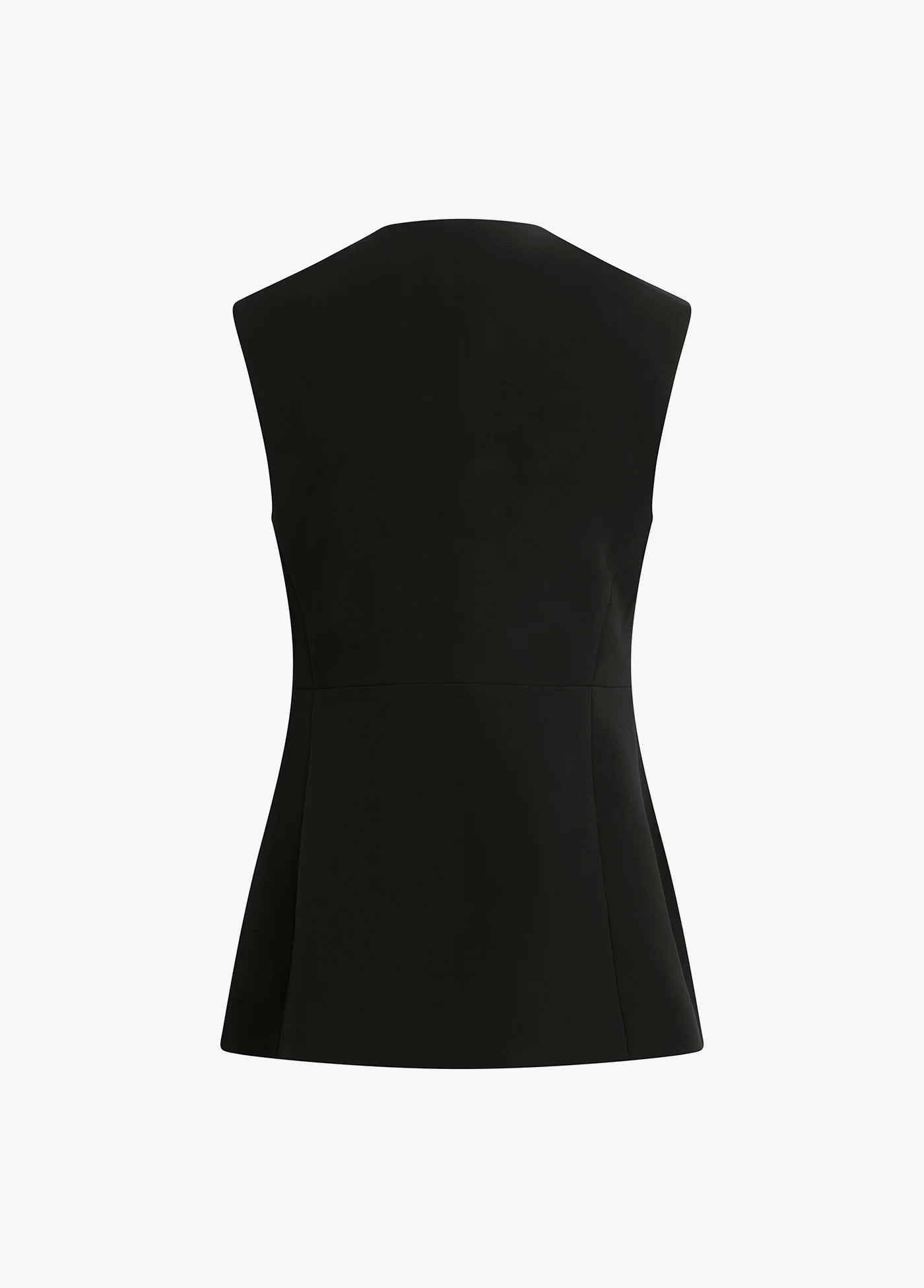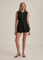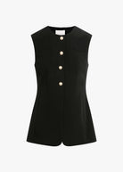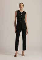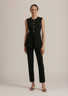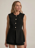 Meet your new workwear favorite. A long-line blazer with a crew neck and front button closure, featuring pearlized gold rim buttons. With a fitted waist and slight peplum shape, this sleeveless top is professional yet chic. Pair it with The Favorite Cigarette Pant when it's time to clock in and look good doing it.
