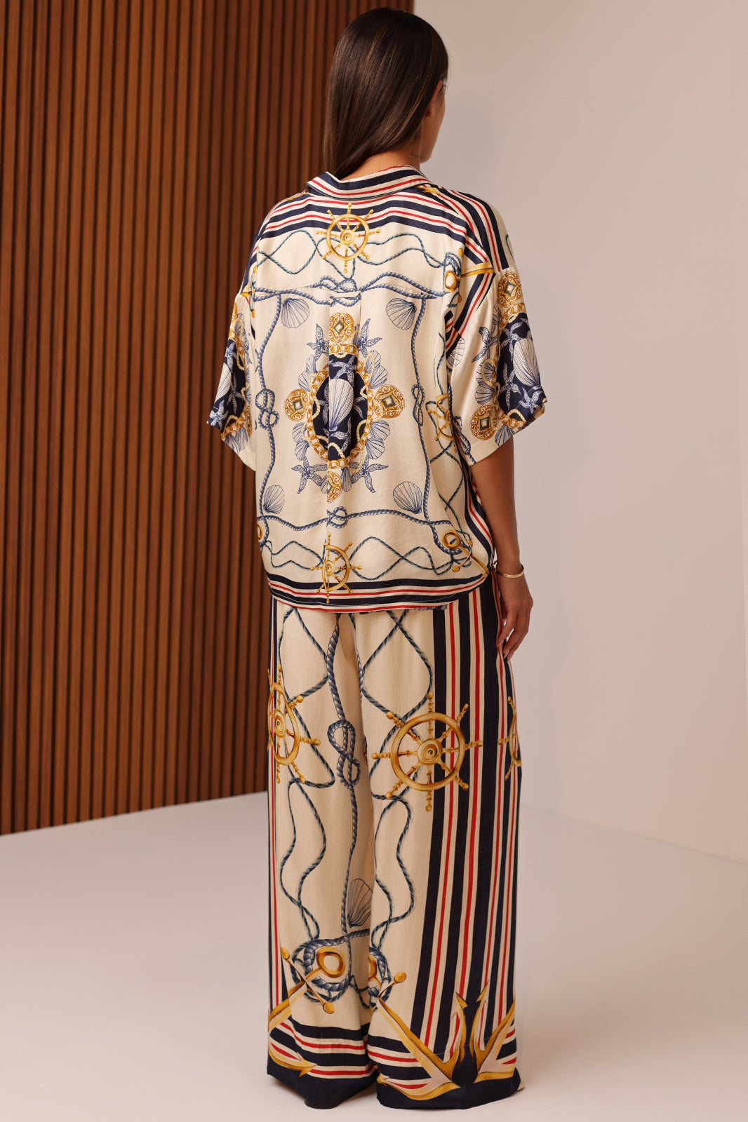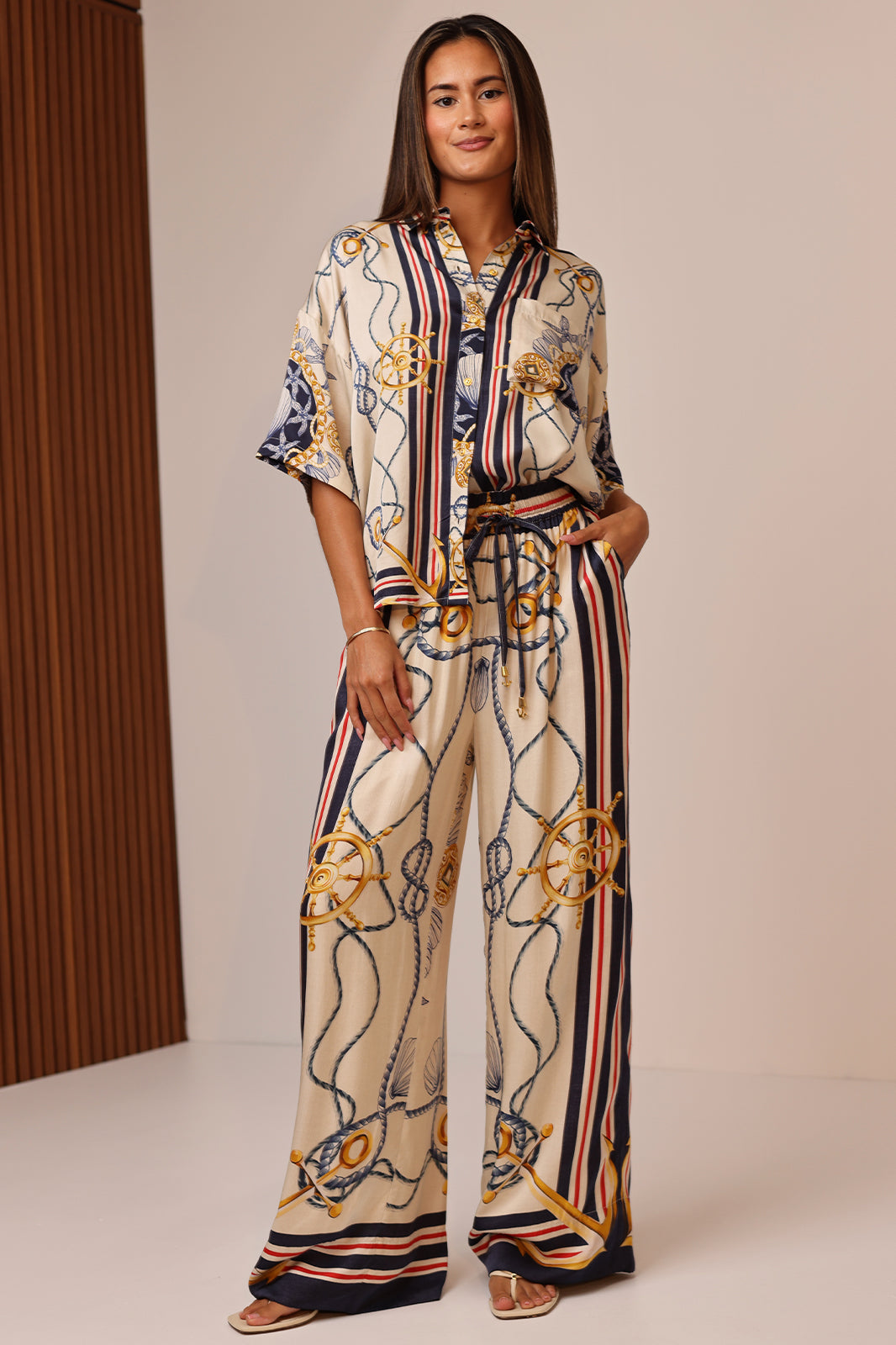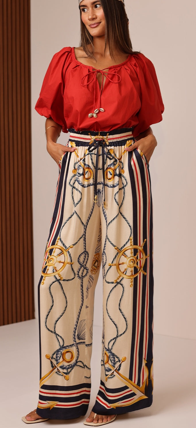 Embrace coastal elegance with these Nautical Caty Pants, featuring a refined silky fabric adorned with anchors and rope motifs in ivory, red, and navy. The relaxed wide-leg silhouette pairs effortlessly with any wardrobe, while the elastic waist and adjustable drawstrings—complete with delicate gold anchor charms—ensure a comfortable, customizable fit. Perfect for those who appreciate nautical-inspired style with understated sophistication.