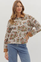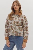 The Vintage Floral Jacket showcases a timeless floral pattern paired with rich brown corduroy details on the collar and cuffs. Classic button closures complete its refined look, making it an elegant choice for those seeking vintage-inspired sophistication.